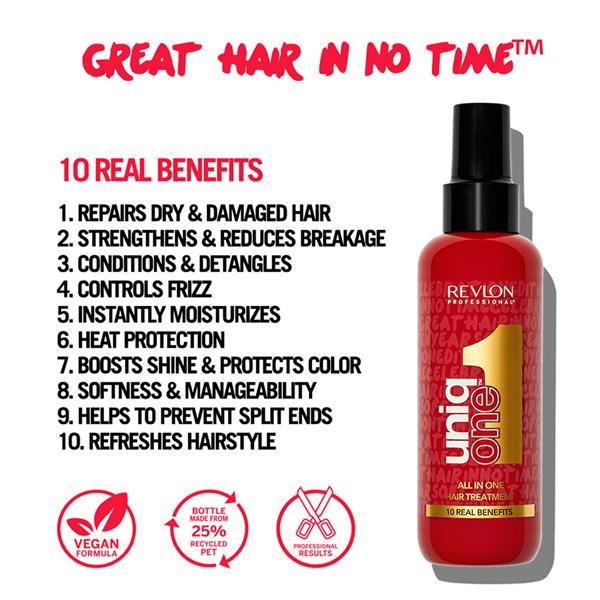 Revlon Uniq1 All In 1 Hair Treatment is the perfect combination of more than 10 active ingredients, such as silk amino acids, silicones and solar filters, provides an innovative formula that offers the 10 main benefits all hair needs.