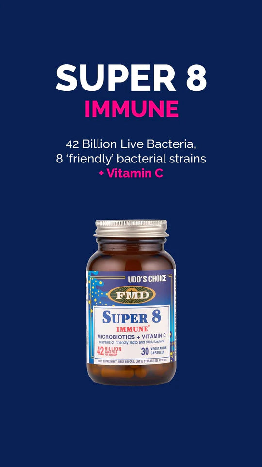 Udos Choice Super 8 is a hi-count microbiotic blend that contains eight strains of lacto and bifido bacteria. Each daily capsule contains 42 billion 'friendly' bacteria & 15mg of Vitamin C.